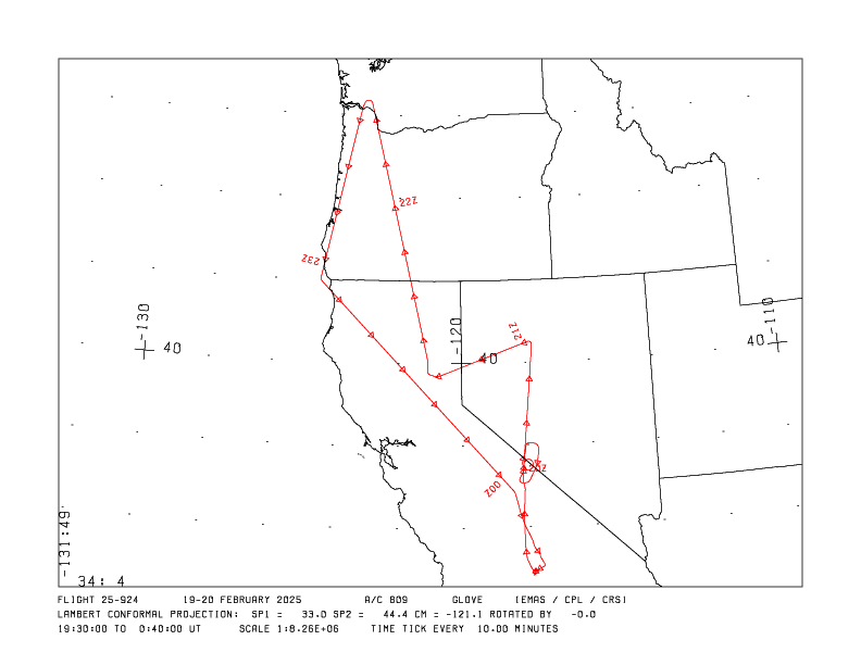 Flight: 25-924 Date: 19 Feb 2025 Campaign: GLOVE Flight Location: Western USA / ICESat-2 / EarthCARE Principal Investigators: Dr. Steven Platnick (NASA GSFC) Additional Sensors: CPL / CRS |