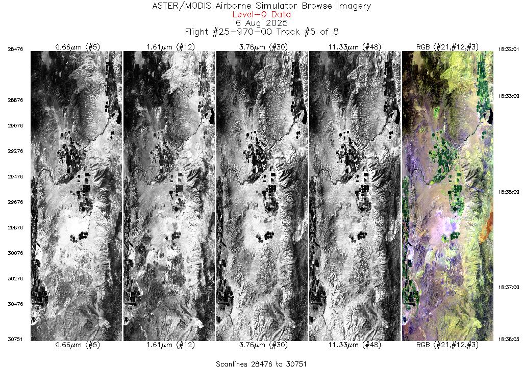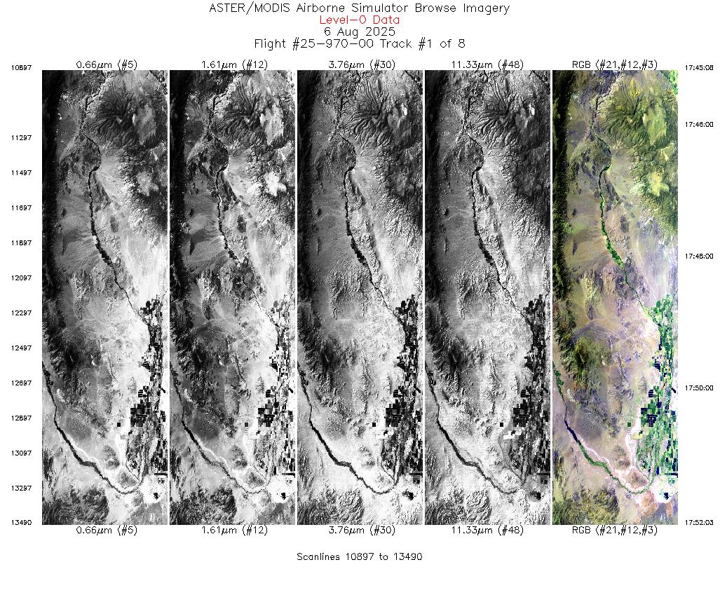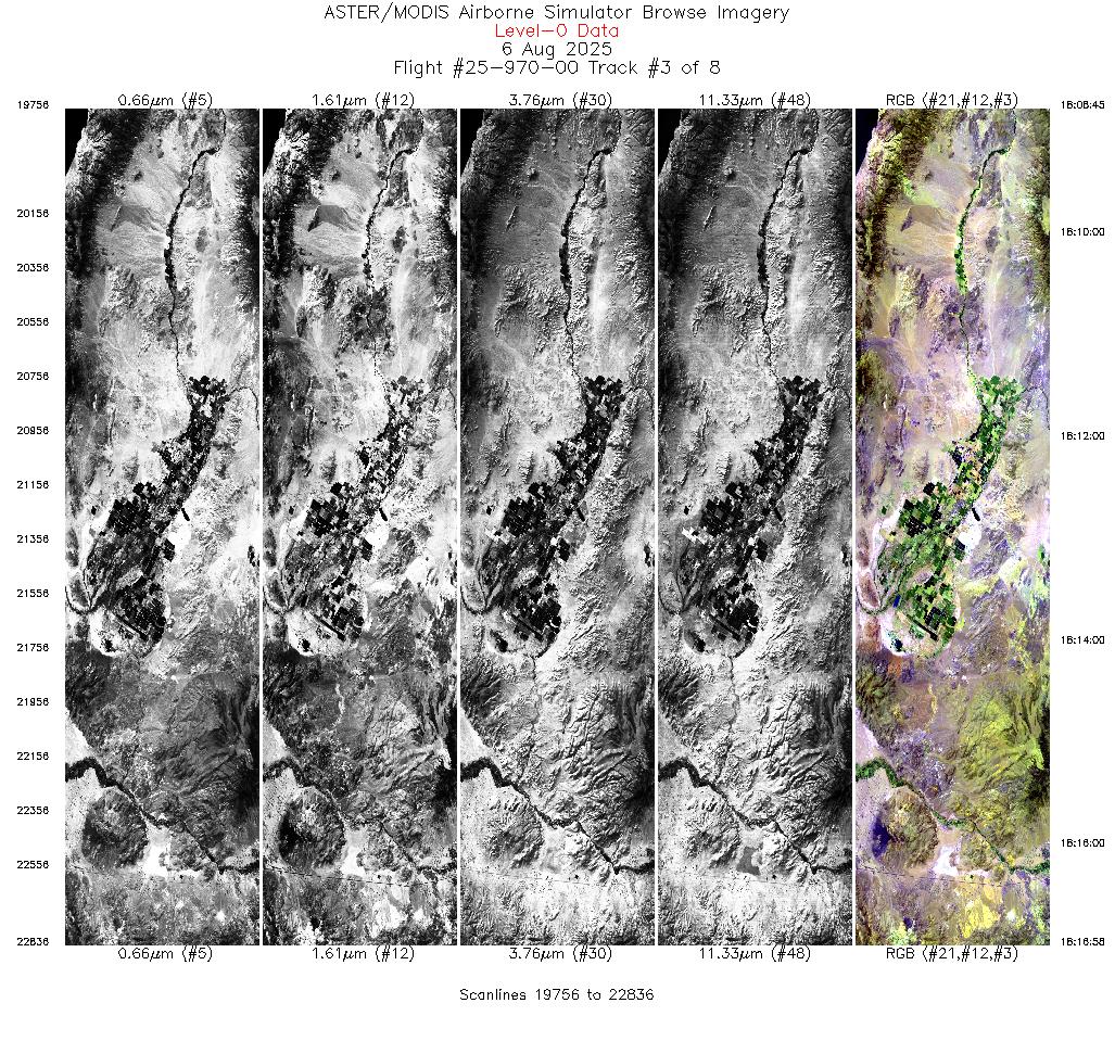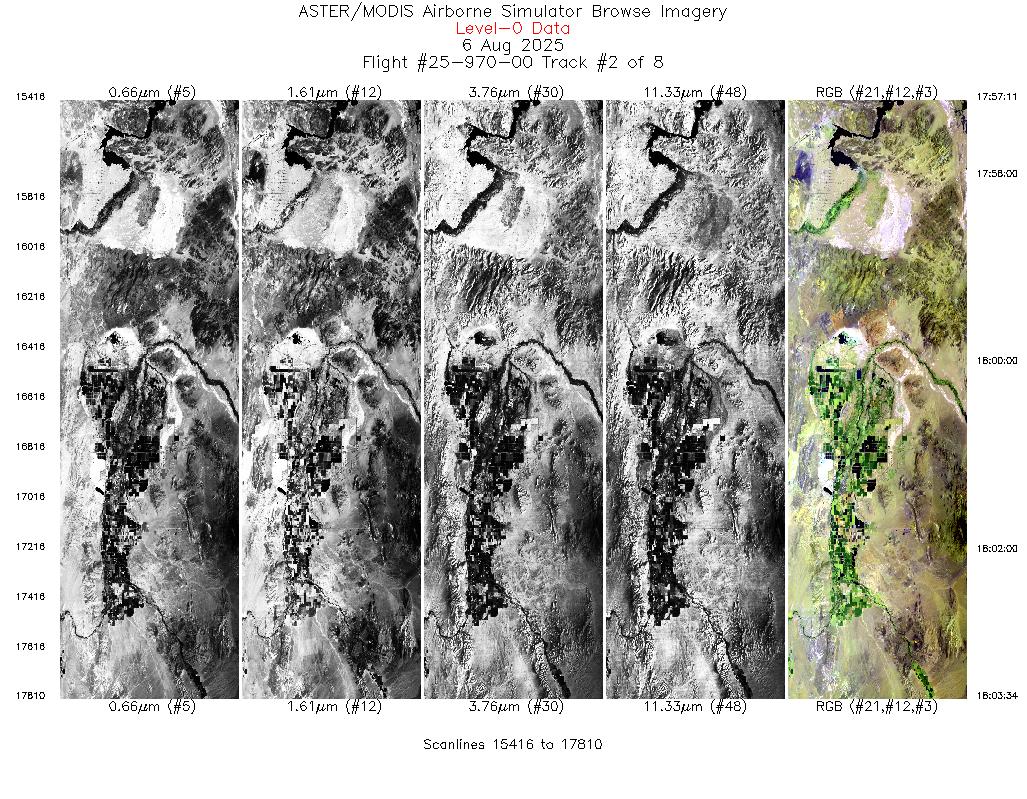 Flight: 25-970-00 Date: 06 Aug 2025 Aircraft: NASA ER-2 #809 Campaign: GEMx 2025 Flight Location: Western Nevada (NV11) Principal Investigators: Kokaly (USGS) Additional Sensors: AVIRIS-C / AVIRIS-5 |