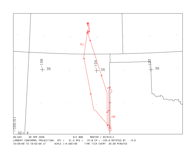 Flight: 26-644-00 Date: 02 Apr 2026 Aircraft: NASA ER-2 #806 Deployment: GEMx 2026 Flight Location: Southeastern New Mexico (NM10) Principal Investigators: Kokaly / Hoefen (USGS) Additional Sensors: AVIRIS-C |