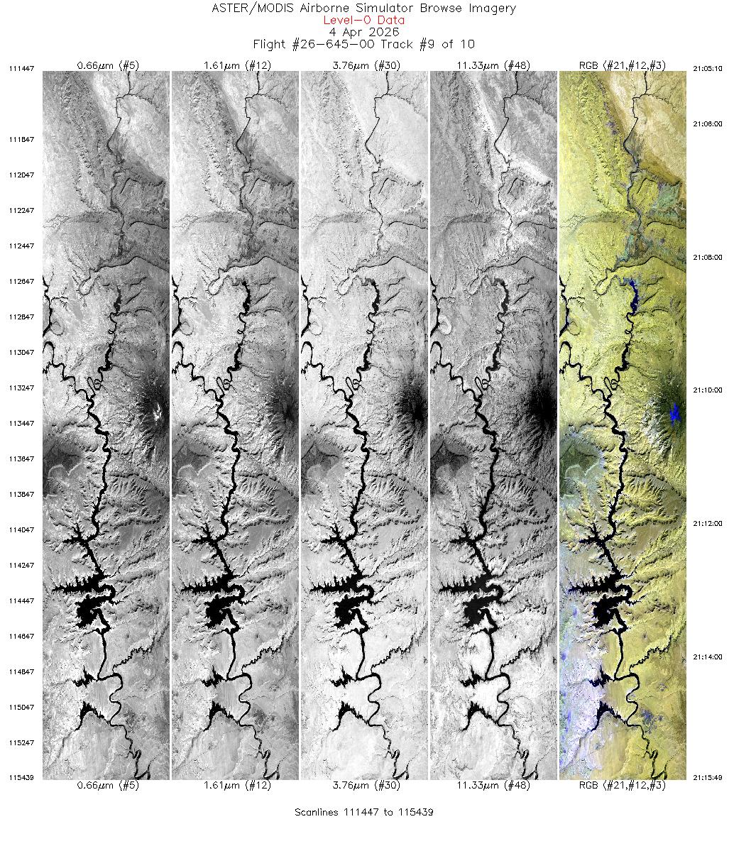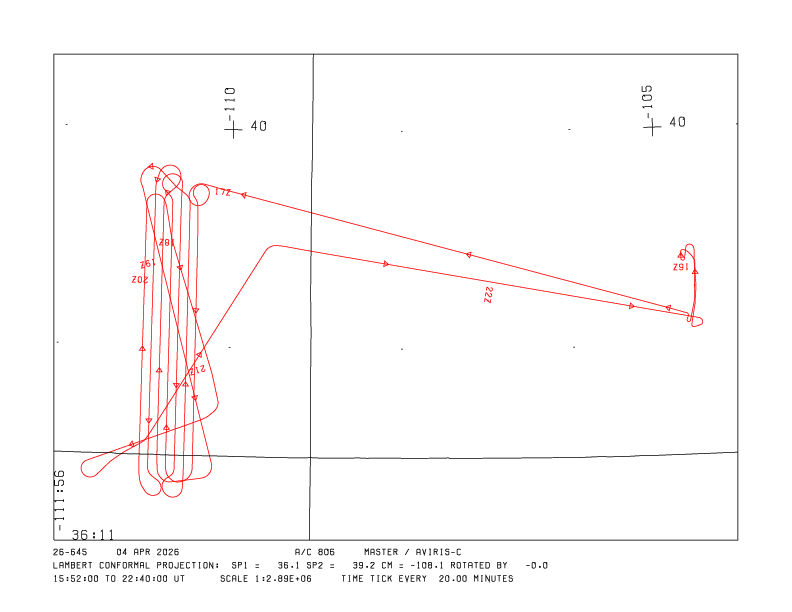 Flight: 26-645-00 Date: 04 Apr 2026 Aircraft: NASA ER-2 #806 Deployment: GEMx 2026 Flight Location: Southeastern Utah (UT04)! Principal Investigators: Kokaly / Hoefen (USGS)) Additional Sensors: AVIRIS-C |