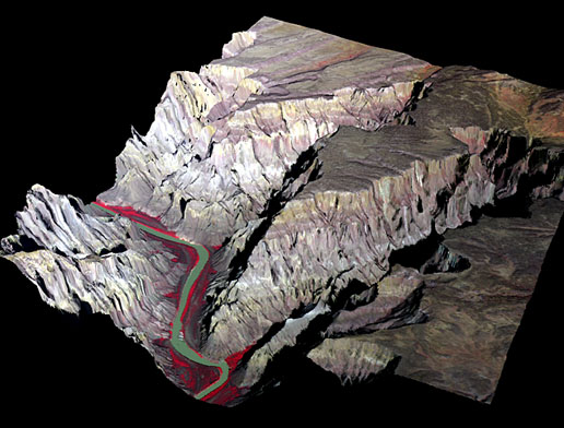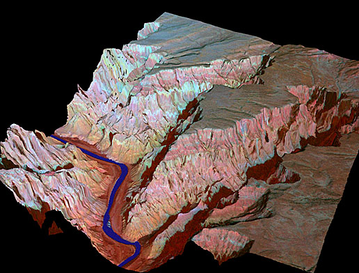 - High altitude 3D MASTER image using a combination of visible and near-IR wavelengths to highlight vegetation along the Colorado River.